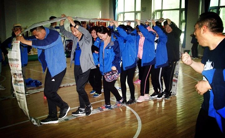 每個(gè)隊(duì)用提供的材料將報(bào)紙圍成一個(gè)可以行進(jìn)的履帶式的環(huán),要求本組所有成員在規(guī)則要求下走完規(guī)定的路程,以最快到達(dá)終點(diǎn)的組為優(yōu)勝。